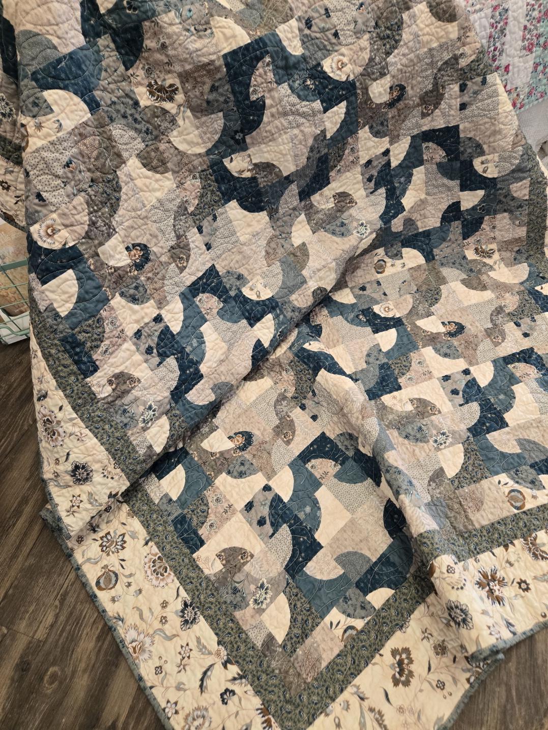 A cozy little throw...a perfect palette of blue, cream, and grey The center is a preprinted panel...making this a super quick, super easy project to whip up.