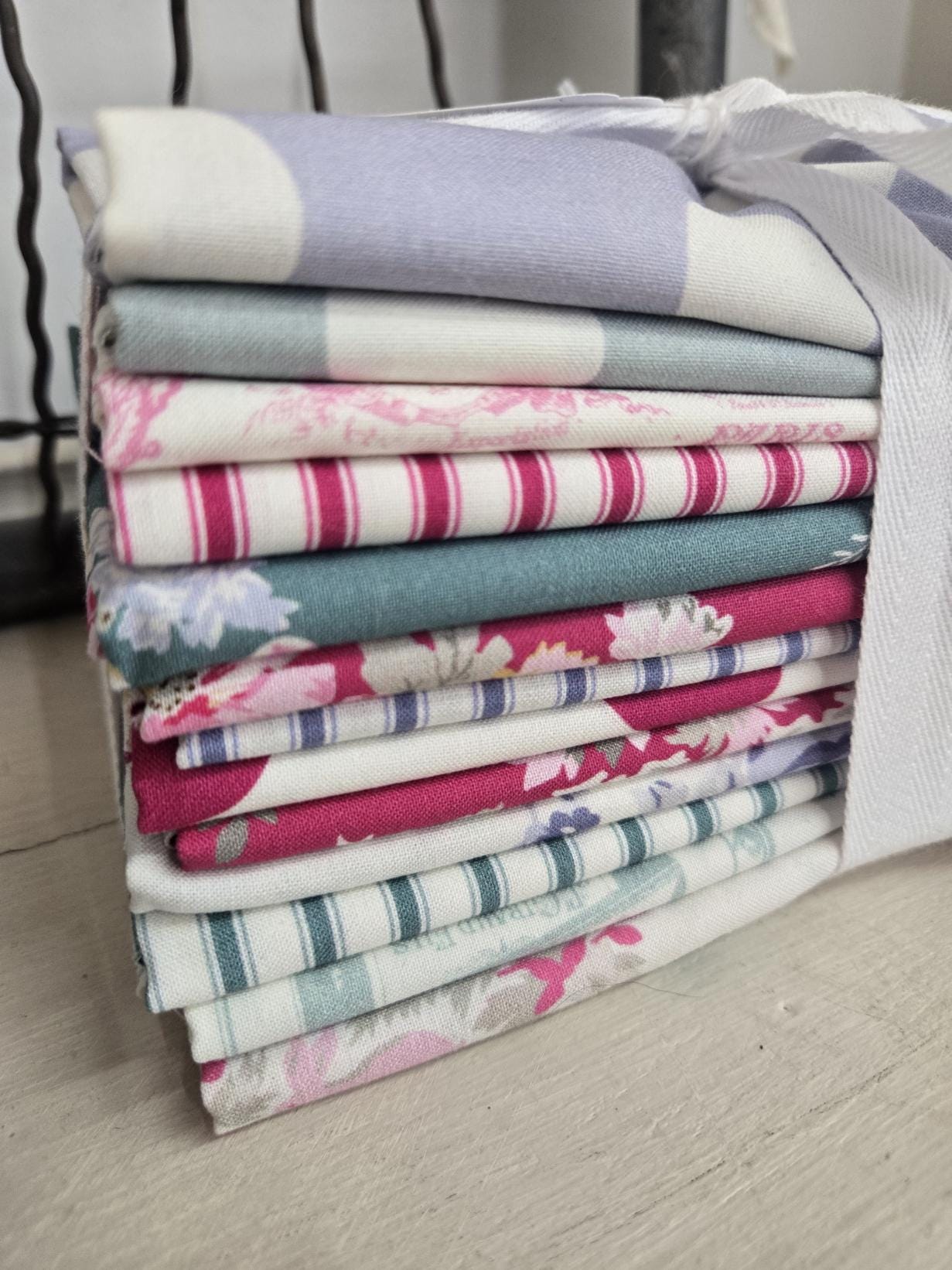 A delightful mixture cottage style florals, stripes, dots, and labels.