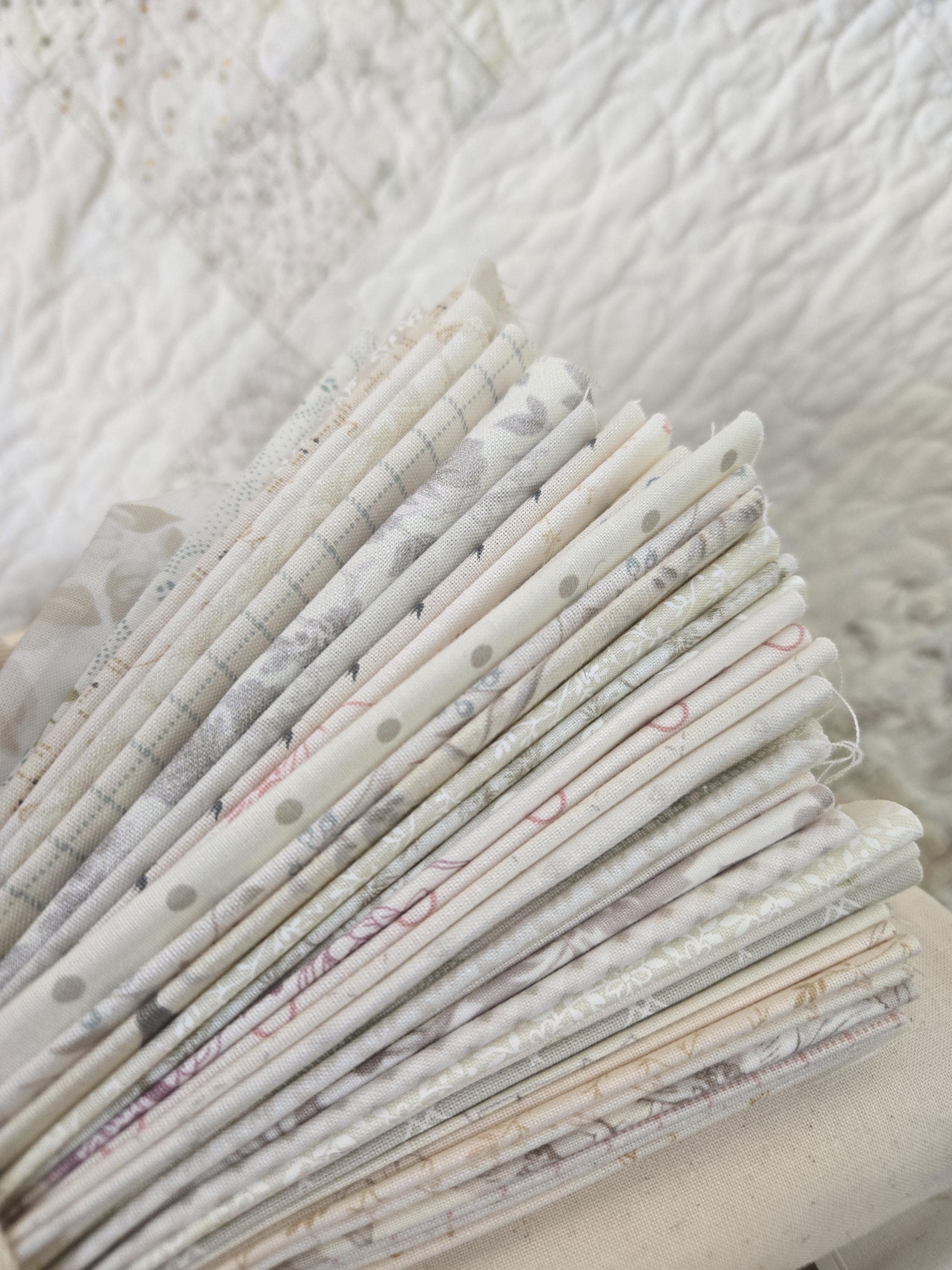 Vanilla Bean kits are similar but no longer identical. Each kit will include a large variety of print...MOST are from both Pebbles and 3 Sisters Vintage Linens which are both in the quilt. Other fabrics included are from the shop and will be from various design houses including Moda, Marcus Fabrics, Windham, Andover, and Studio E.