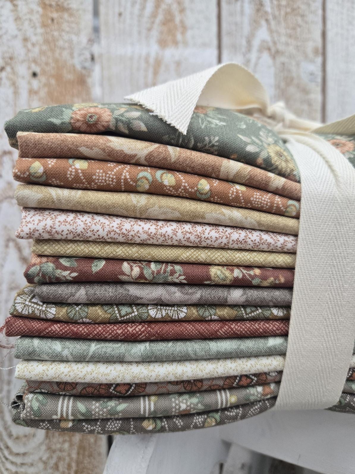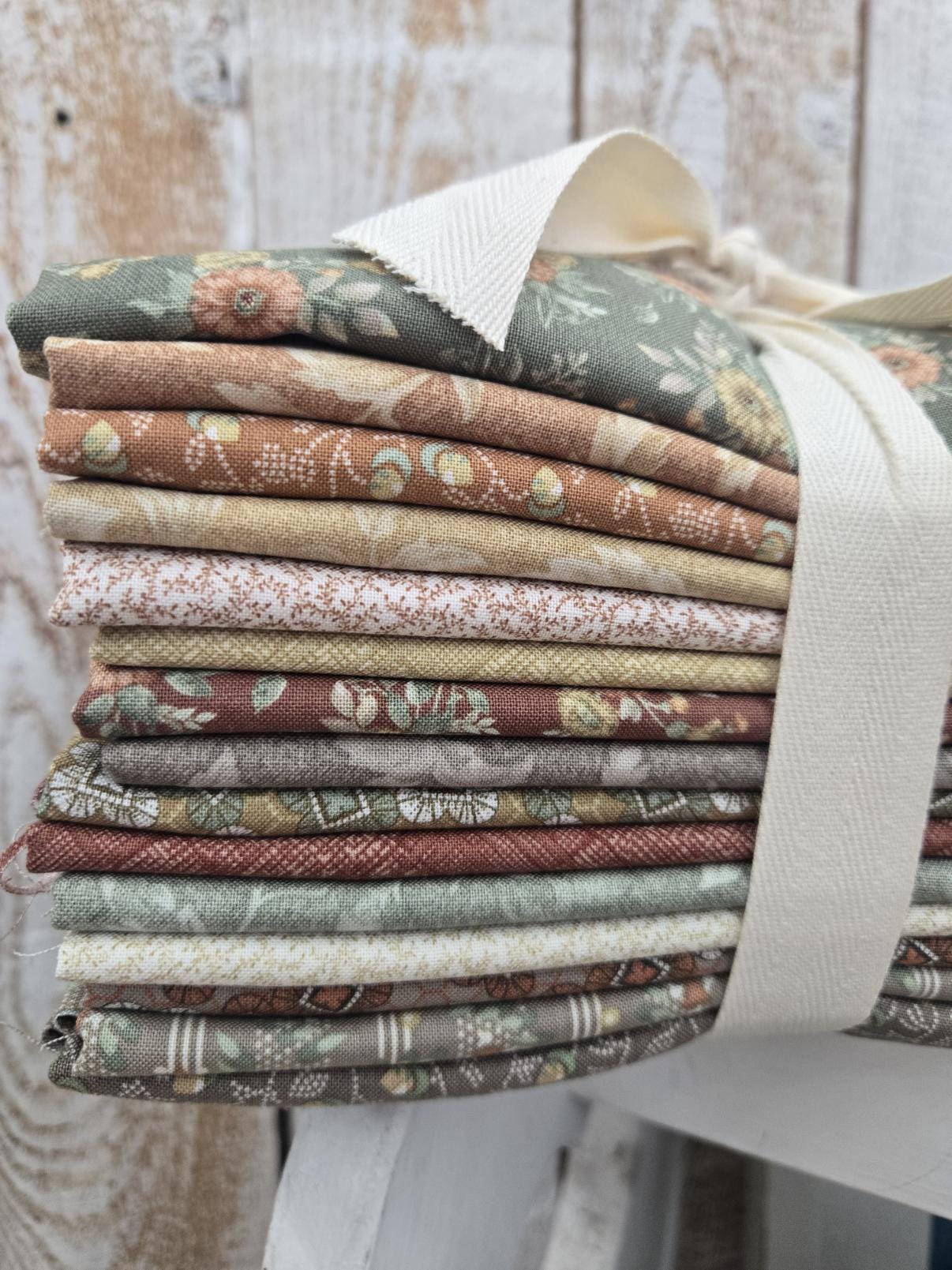 "Dolores Smith (Timeworn Toolbox Designs) finds inspiration in the simple pleasures: "Fall is my favorite time of the year, with moments spent watching the changing colors, sitting on my front porch under a cozy fall quilt, done in the same beautiful colors inspired by the season. While sipping a cup of coffee or cocoa, of course." Her gentle palette of sage, gold, rust and taupe are shown in beautifully textured florals and coordinates."