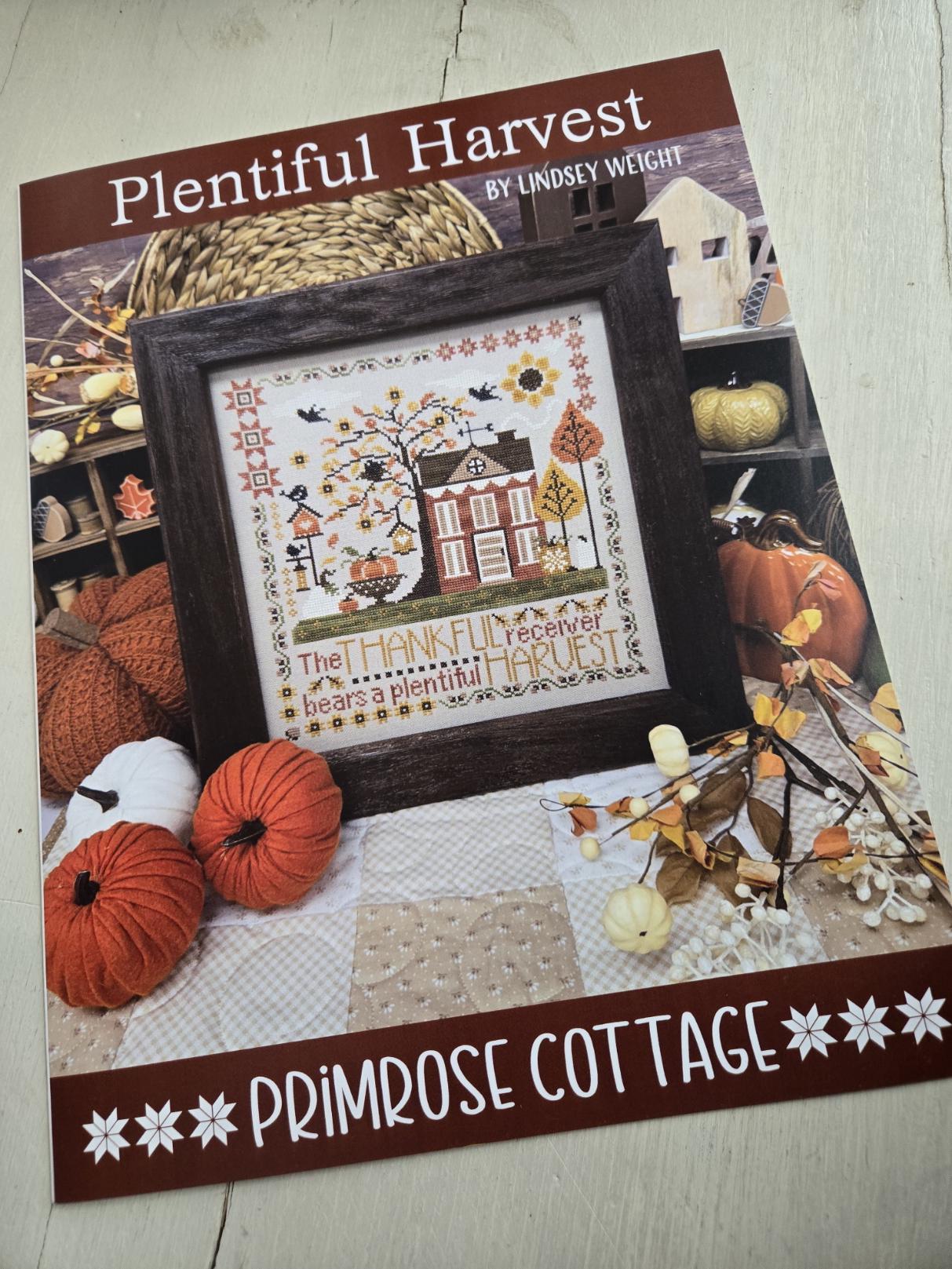 A cozy autumn stitch featuring pumpkins, a home, sunflower, changing trees, and birds along with the quote "The Thankful receiver bears a plentiful Harvest".
