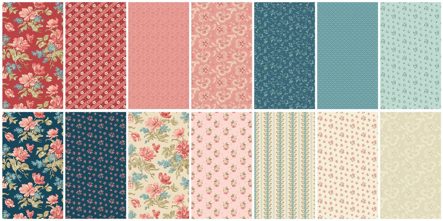 A delightful combination of prints and patterns in shades of navy, cherry ice cream, sun kissed, red roof, and splash.