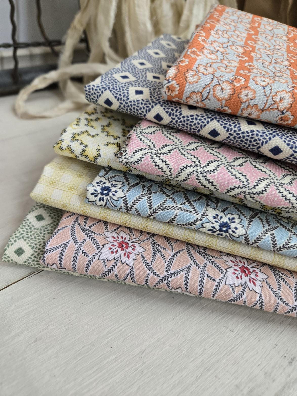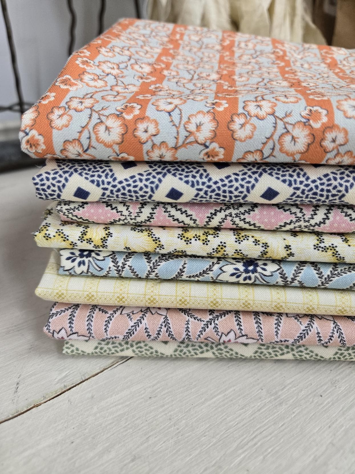 A cozy combination of florals, geometrics, and low volume shirting prints. The perfect inspiration for a scrappy..."Flea Market" style project.
