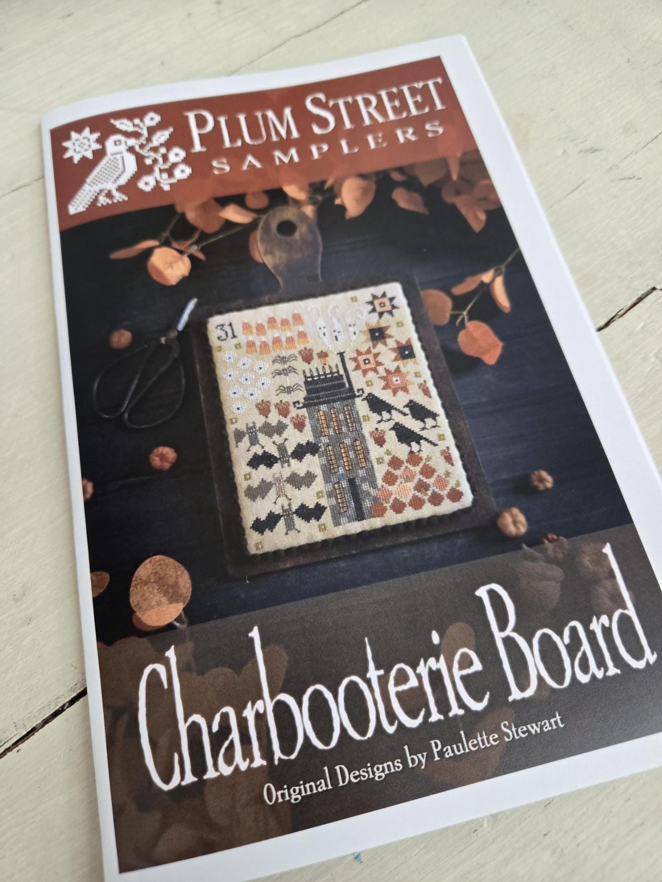 A fun little project that features a myriad of autumn goodies...including candy corn, eyeballs, spiders, ghosts, bats, pumpkins, and crows surrounding a gothic house.