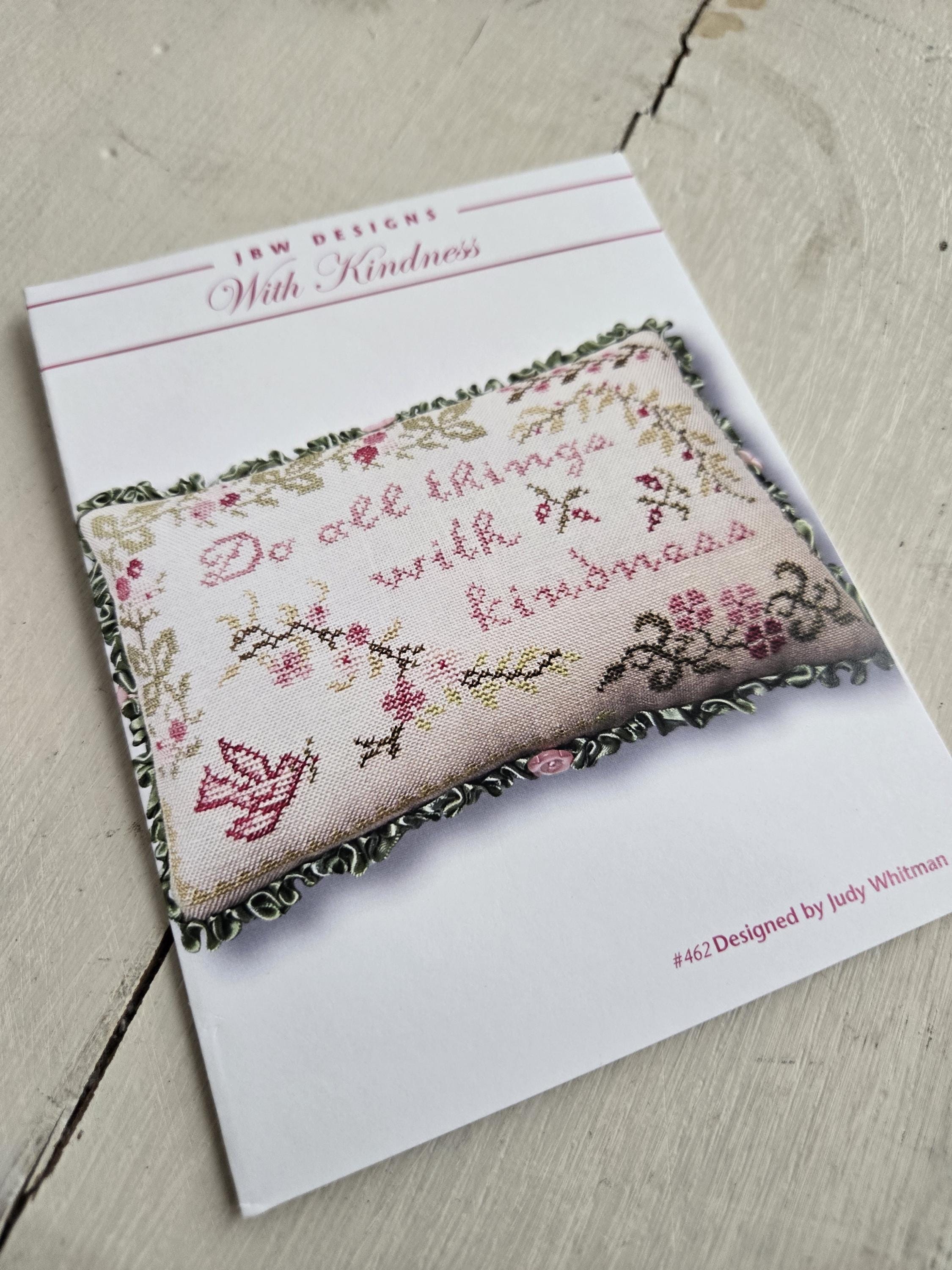 A lovely cross stitch project featuring flowers, vines, a dove, and the quote "Do all things with kindness."