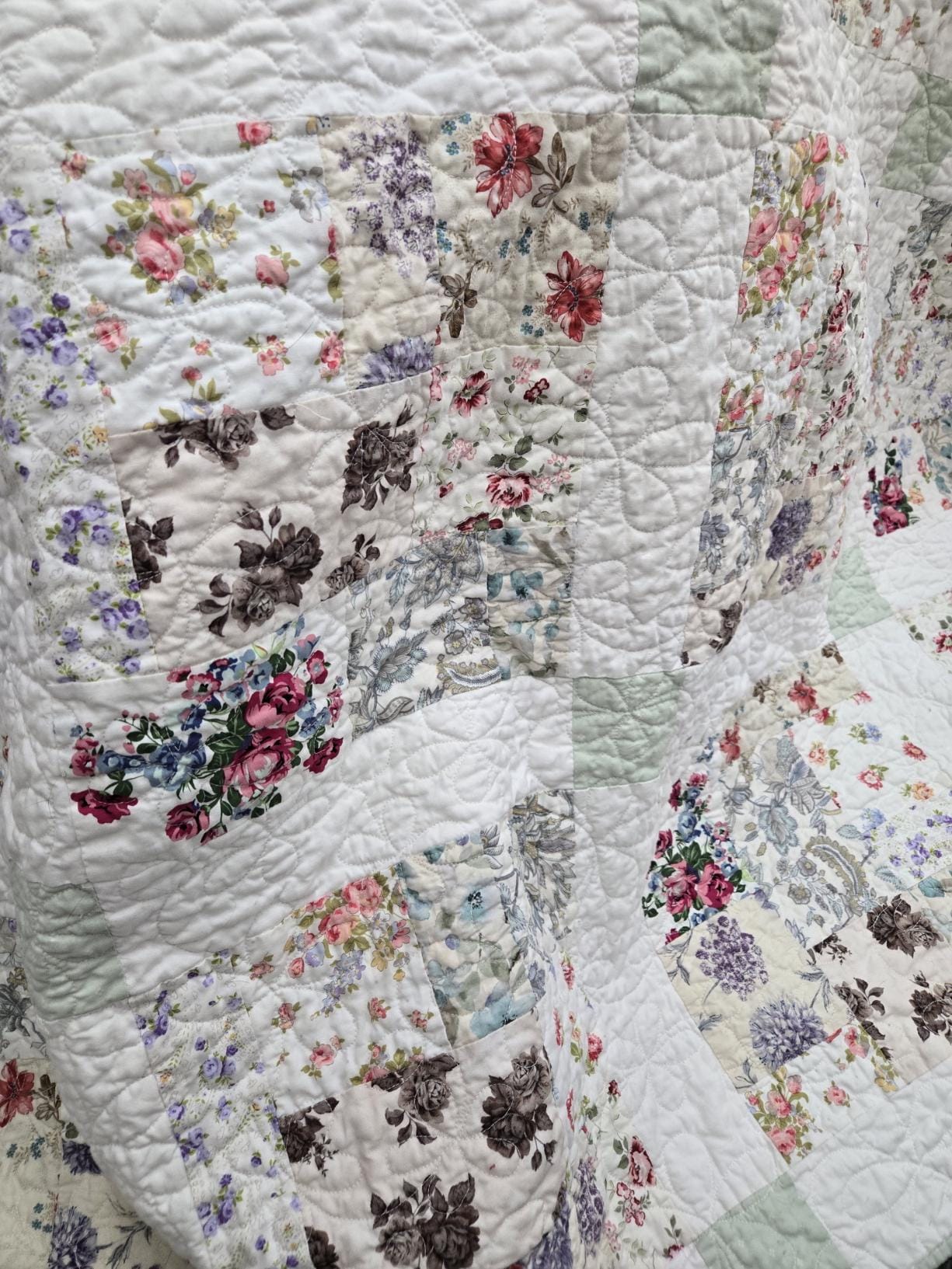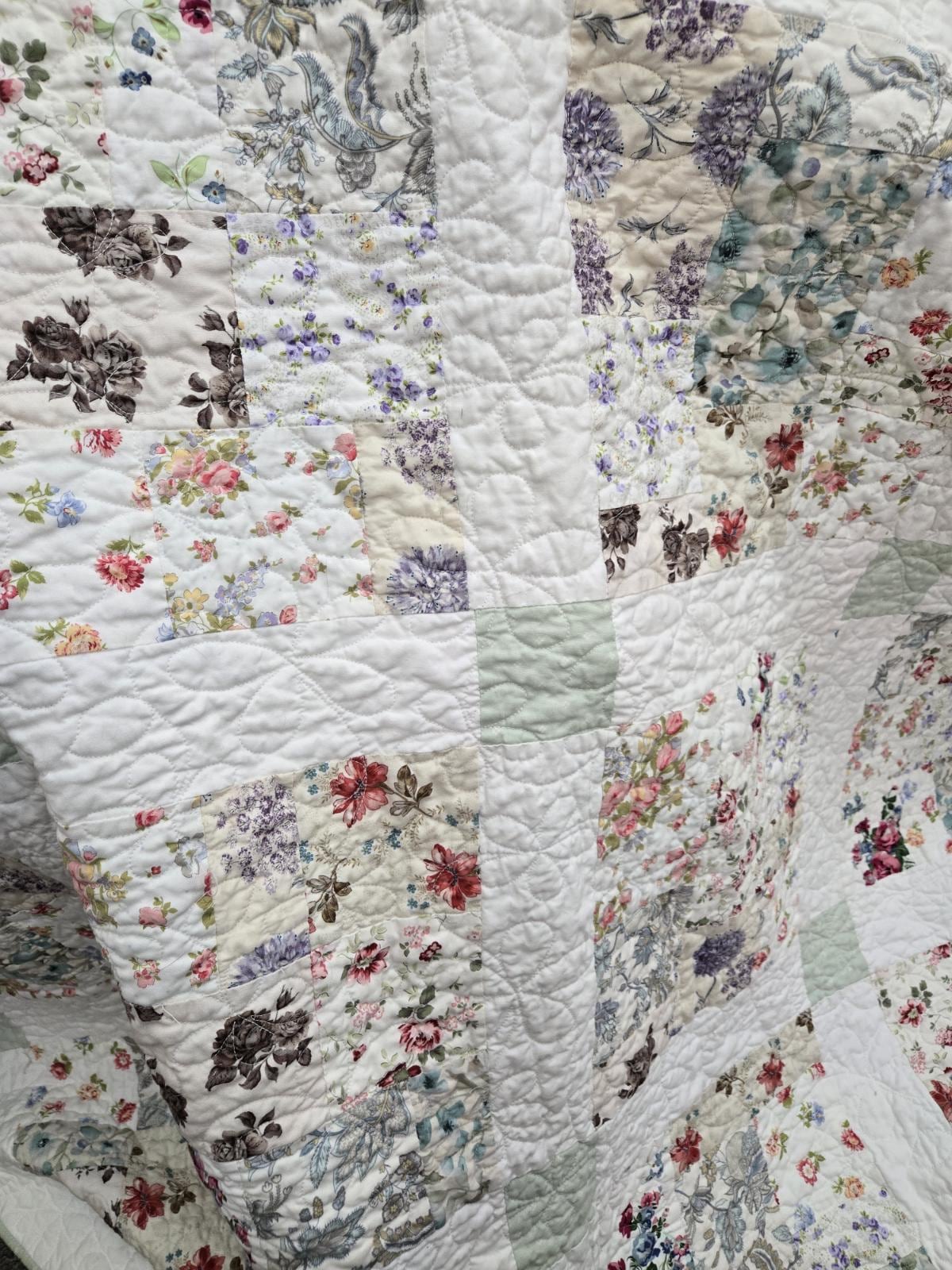 A patchwork collage...these blocks are reminiscent of junk journals, scrap books, and vision boards. Each block a myriad of floral prints that compliment each other and create a wonderful bouquet of prints. Set with white sashing and soft minty green cornerstones and binding...Lovelier is just that...lovelier!