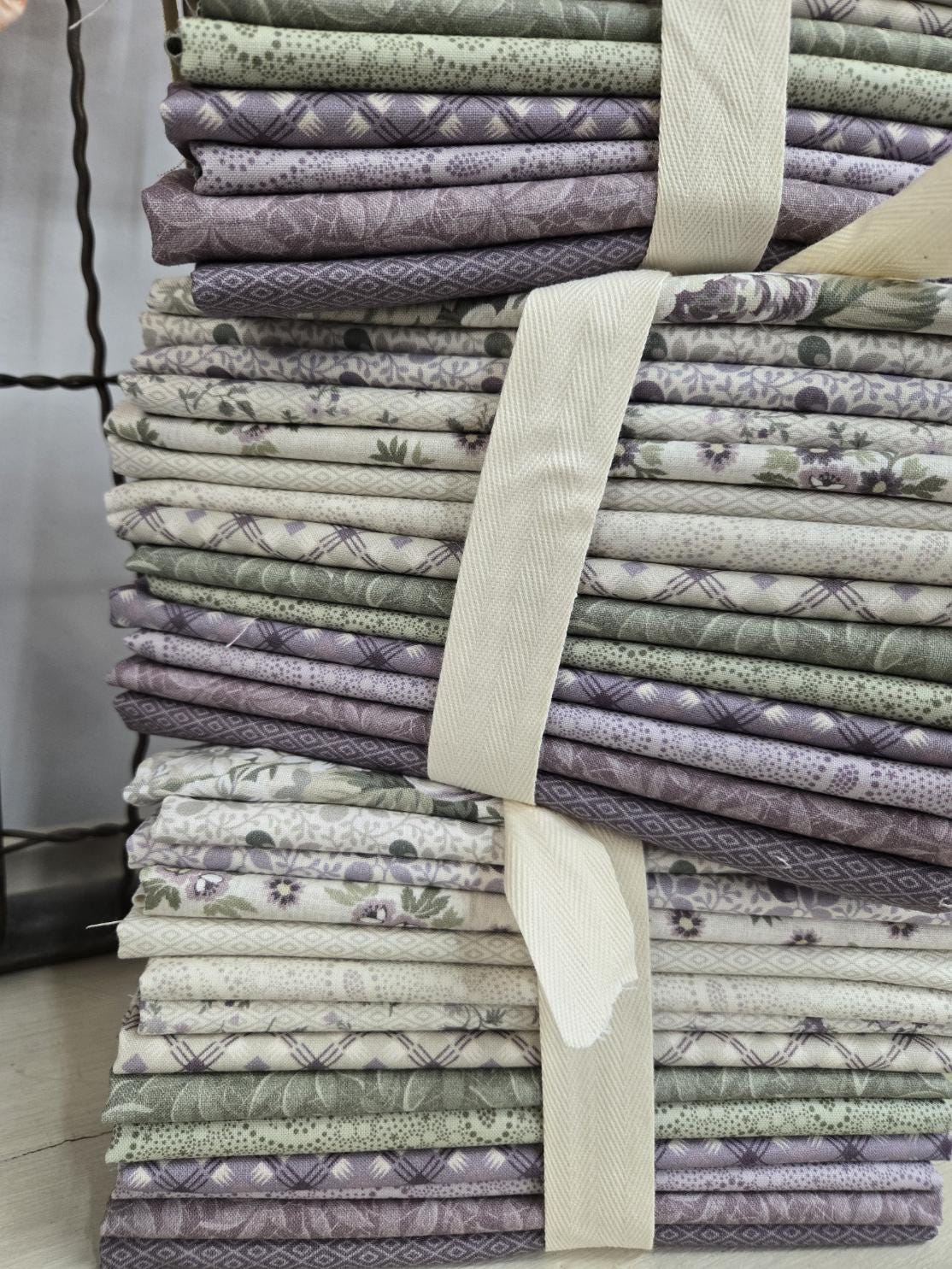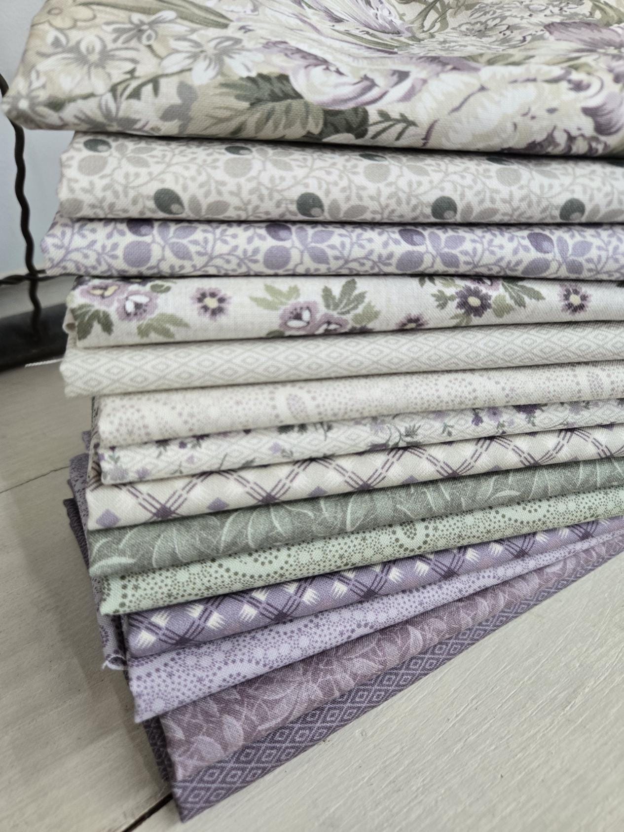 A gentle combination of sage, purple and cream...a lovely paisley, geometrics along with a ditsy and bouquet floral prints. A perfect collection for a springtime project.