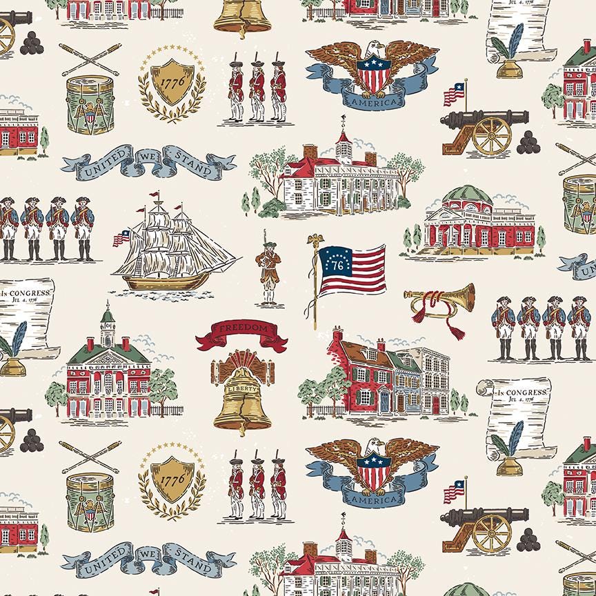Celebrate 250 years with this Americana inspired collection featuring roses, 13 colonies map, stars, flags, and the Declaration of Independence, and drums. A palette of red, light and dark blue, gold, beige, and white keep it wonderfully patriotic.