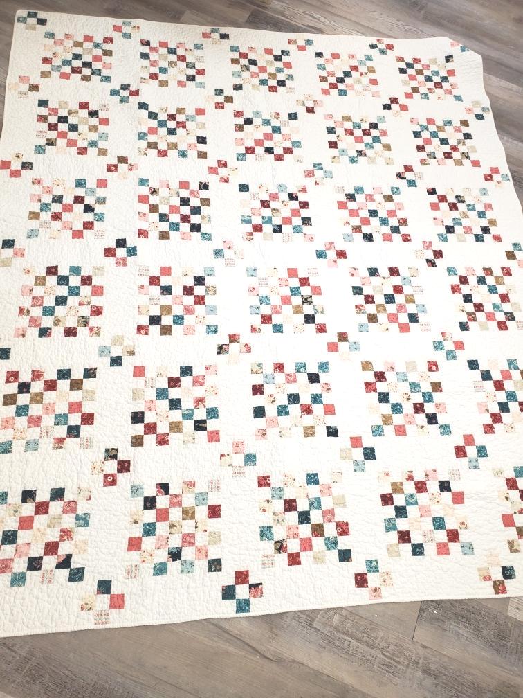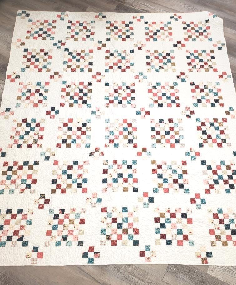 A classic checkerboard paired with sashing and 9-patch cornerstones create an Irish chain-styled quilt. Shades of pink, navy, blue, tan, and red give off an Americana vibe if paired with red, white, and blue pillows and bunting. Otherwise, opt for white shams for a vintage vibe. Quilt measures approximately 81 x 95 inches.
