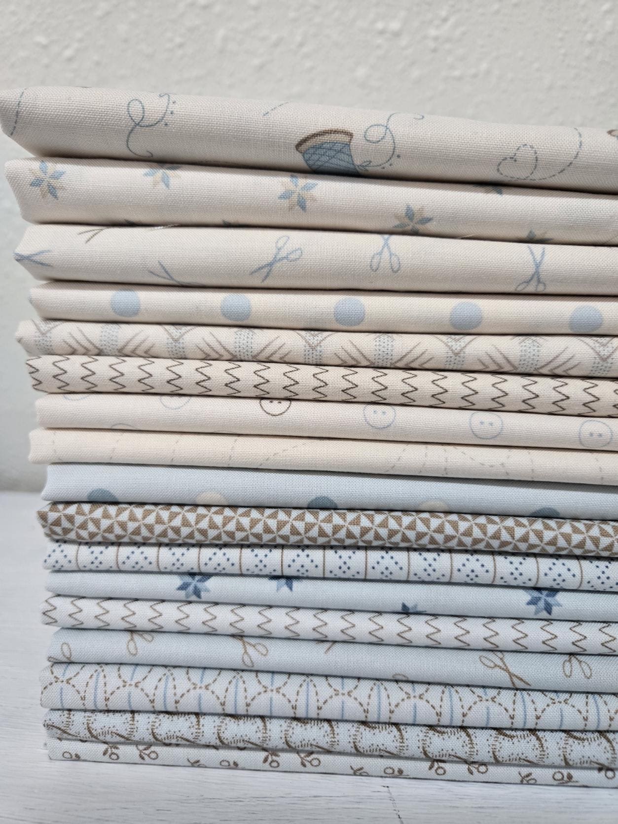 A collection of blue and creams, featuring florals, geometrics, birds, and sewing bits including scissors, spools of thread, and needles. Perfect for quilts, project bags, and runners.
