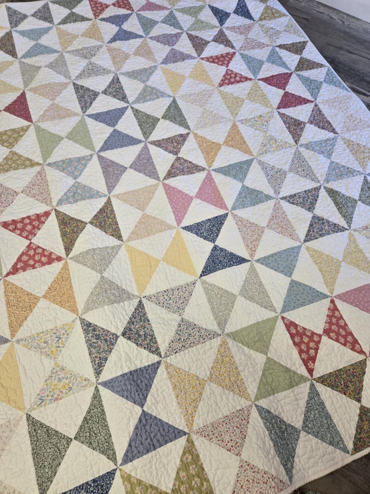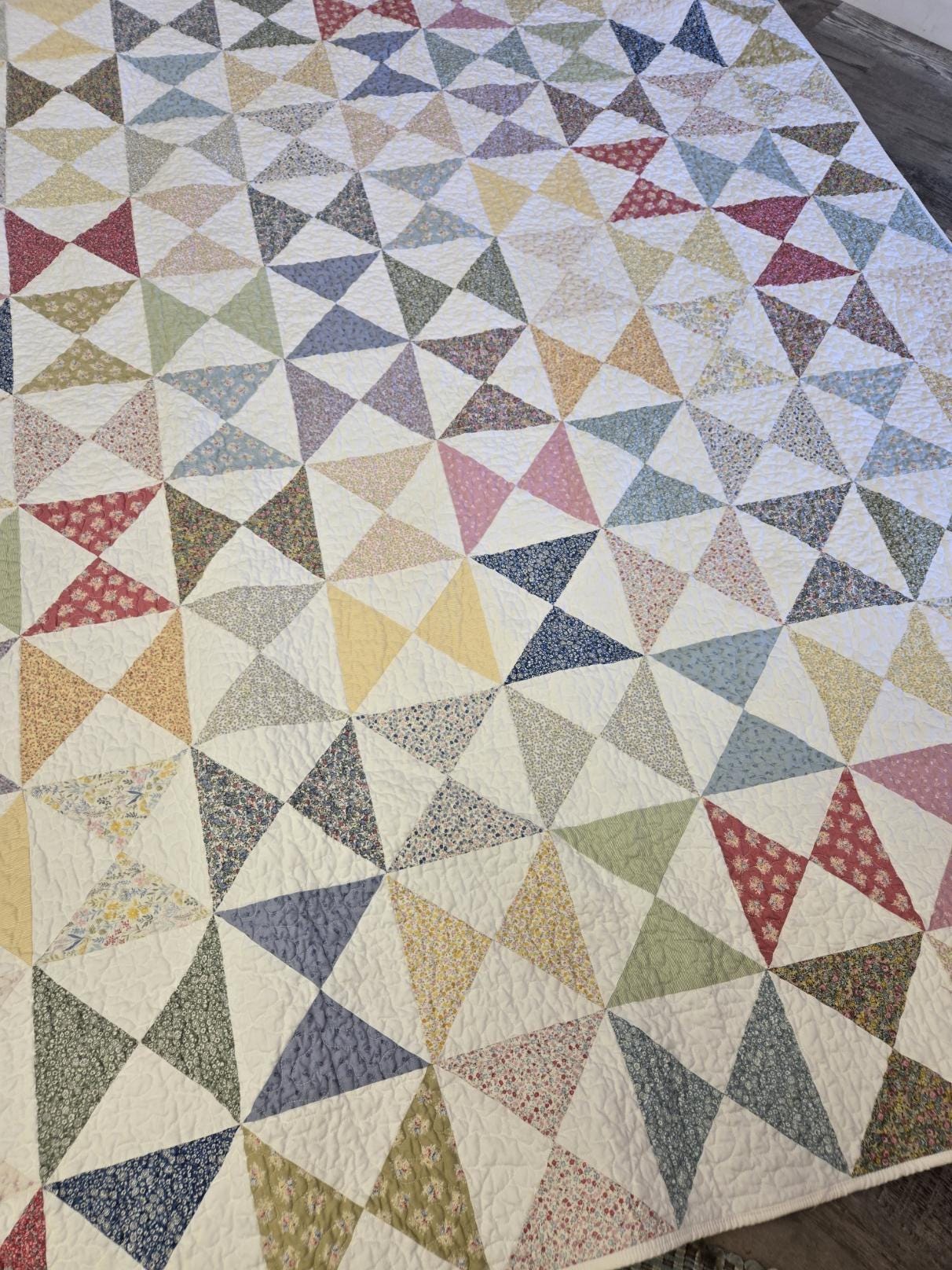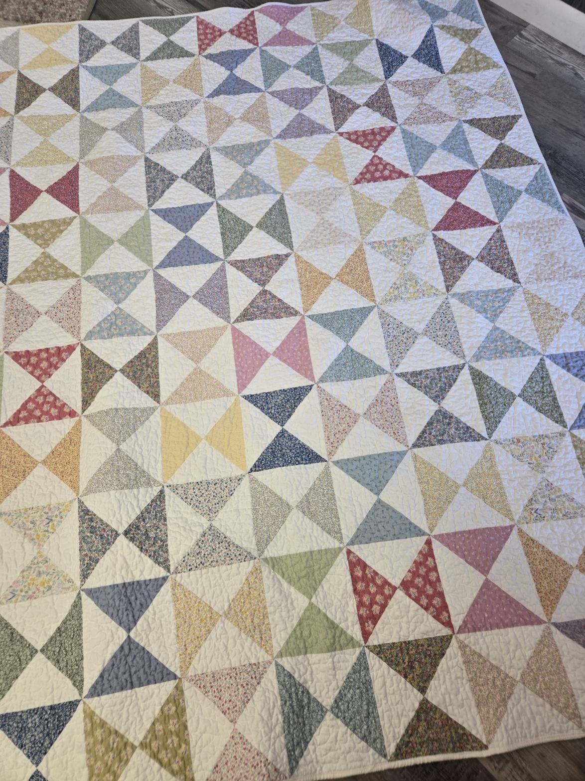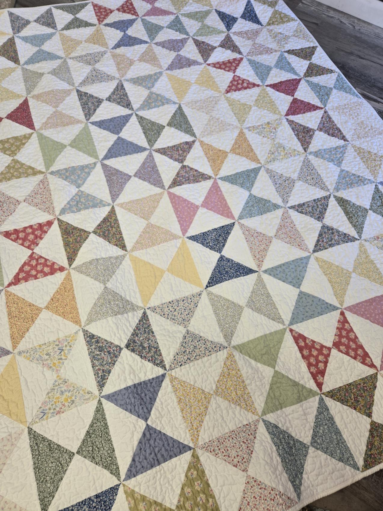 A study in flowers and hourglasses...this project was inspired by a vintage hourglass quilt featuring washed-out tiny florals. A wonderful way to pay homage to tiny florals and classic blocks. Measuring 63 x 77 this quilt makes a wonderful cozy throw.